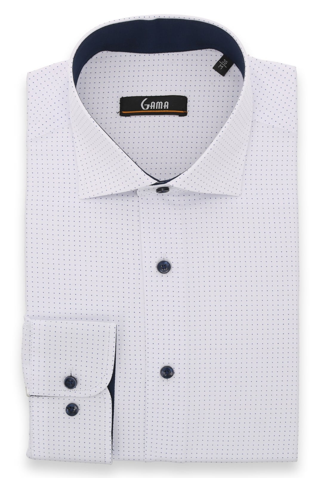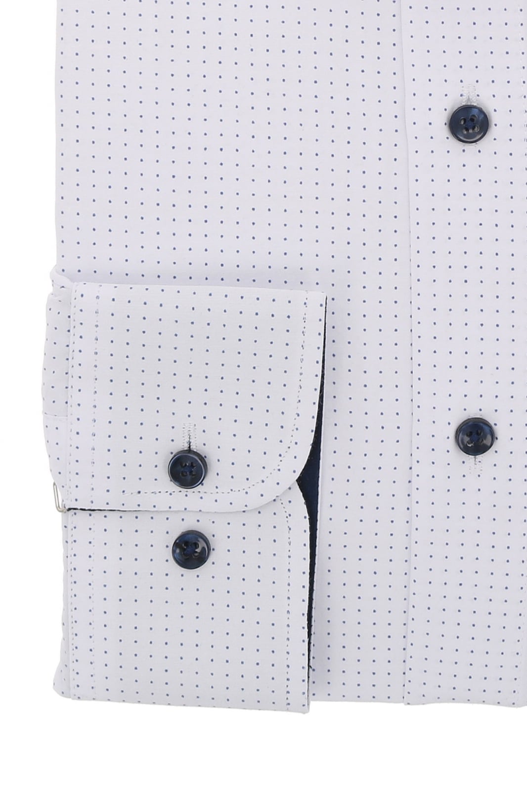 Camasa alba cu buline bleumarin, nasturi asortati si garnitura asortata la interiorul gulerului si al mansetelor. O camasa potrivita atat pentru o zi la birou.