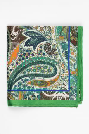Batista ivoire cu margini verzi si imprimeu floral portocaliu, verde si albastru un accesoriu perfect care te ajuta sa te faci remarcat. O poți purta impaturita cu volum in buzunarul sacoului pentru o tinuta casual sau pliata intr-un mod elegant pentru tinute formale.