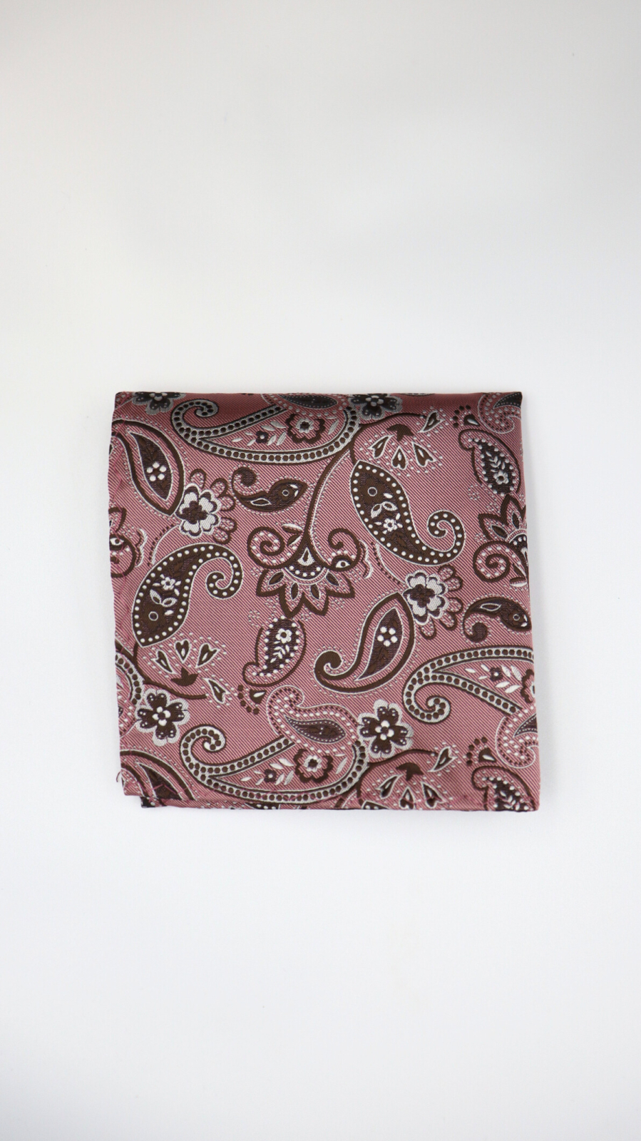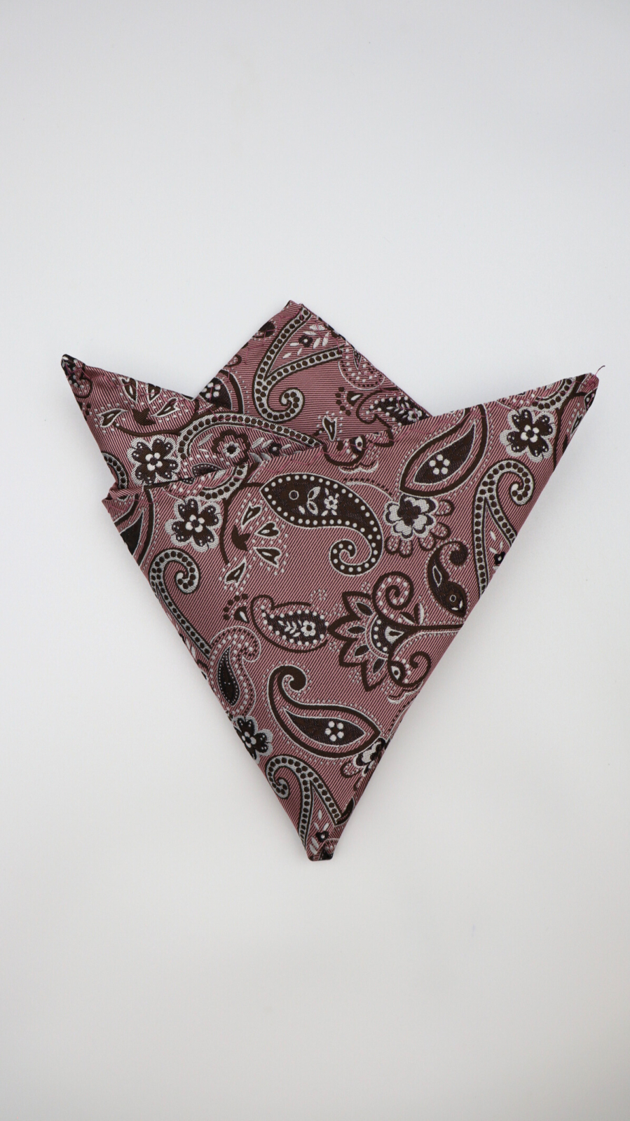 Această batistă GAMA propune o combinație cromatică bine controlată, în care rozul prăfuit este echilibrat de detalii paisley în tonuri de maro închis și accente deschise. Rezultatul este un accesoriu cu personalitate, dar ușor de integrat, care adaugă căldură fără să devină dominant.