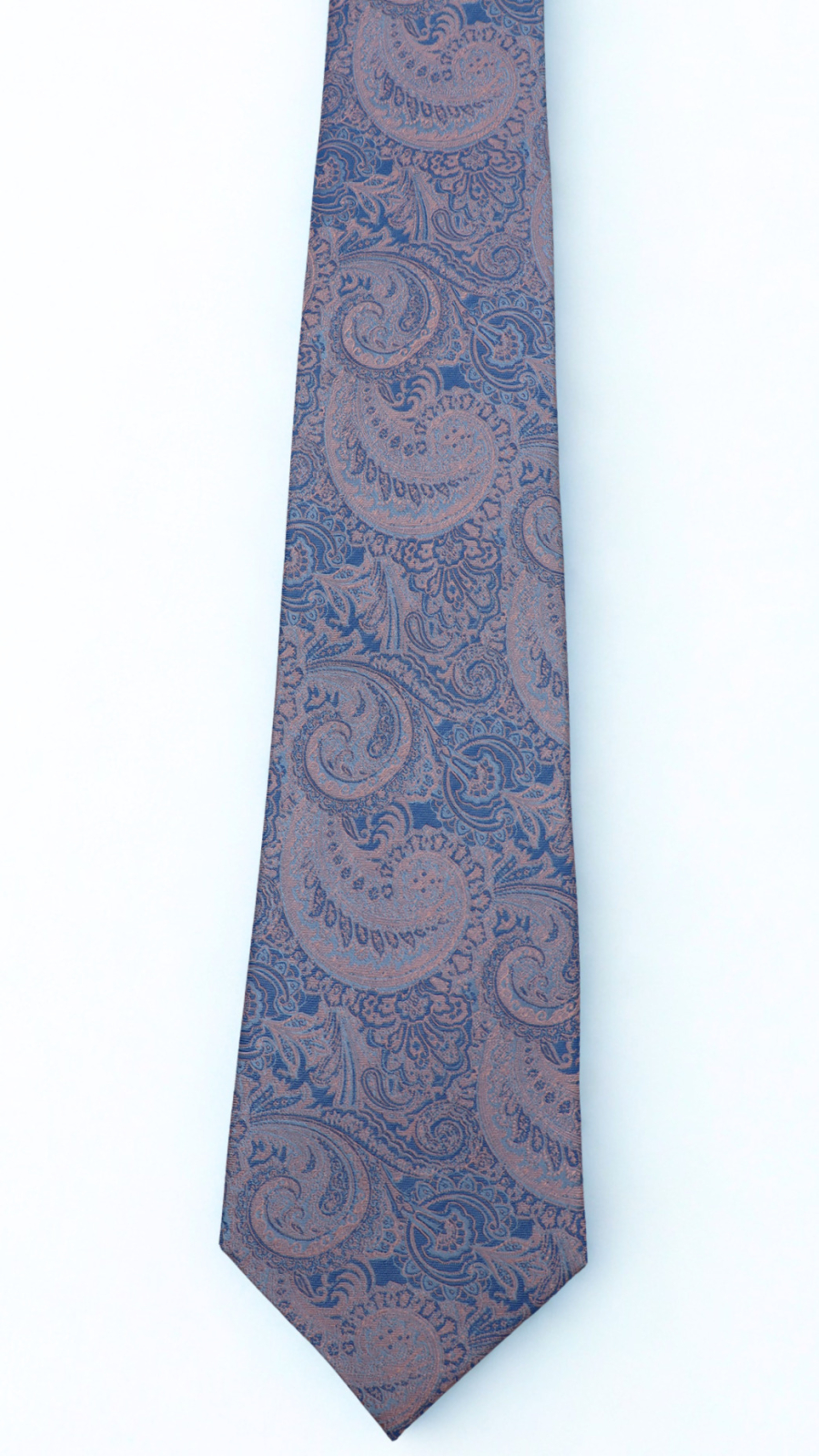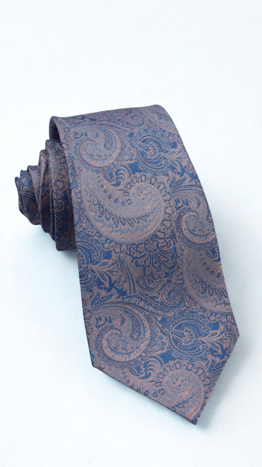 Combinația dintre albastru prăfuit și tonurile calde creează o cravată versatilă, potrivită atât pentru ținute elegante de zi, cât și pentru apariții sofisticate.