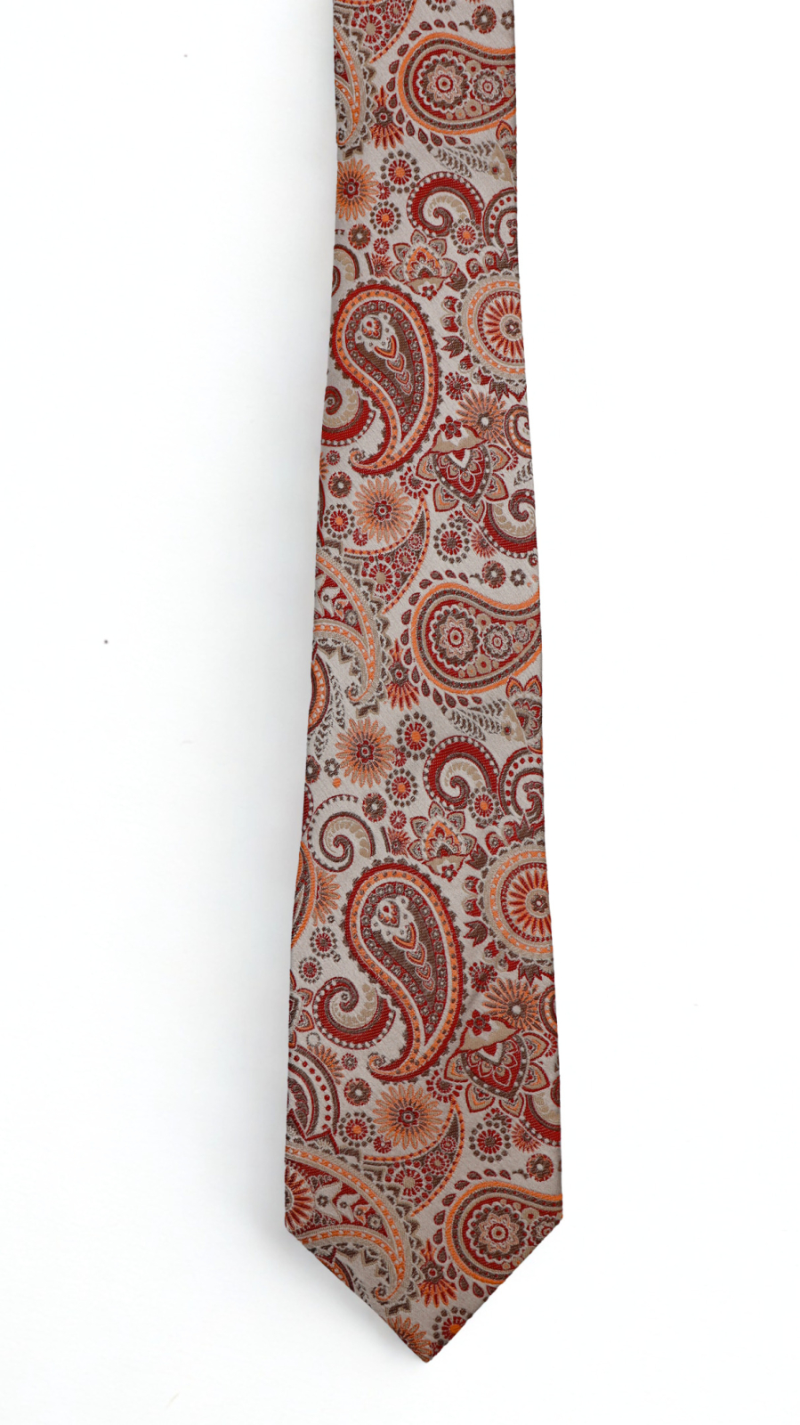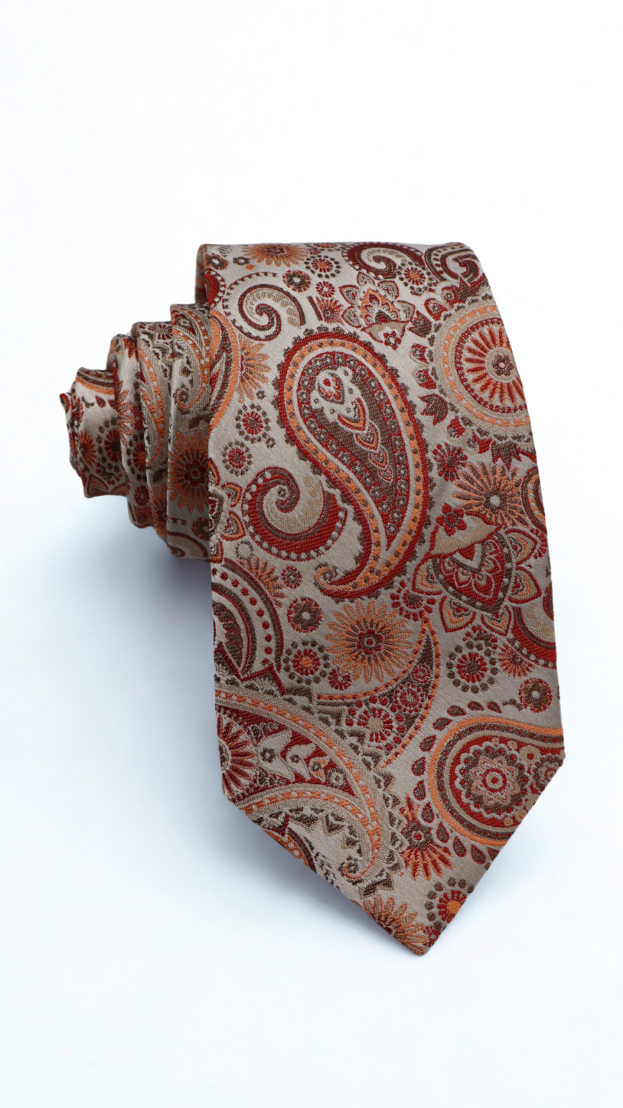 Luminoasă și sofisticată, această cravată din mătase naturală este alegerea ideală pentru ținute elegante cu personalitate. Fundalul ivoire, delicat și rafinat, este pus în valoare de un model paisley bogat, în nuanțe calde de roșu, maro și portocaliu, creând un contrast armonios și plin de expresivitate.