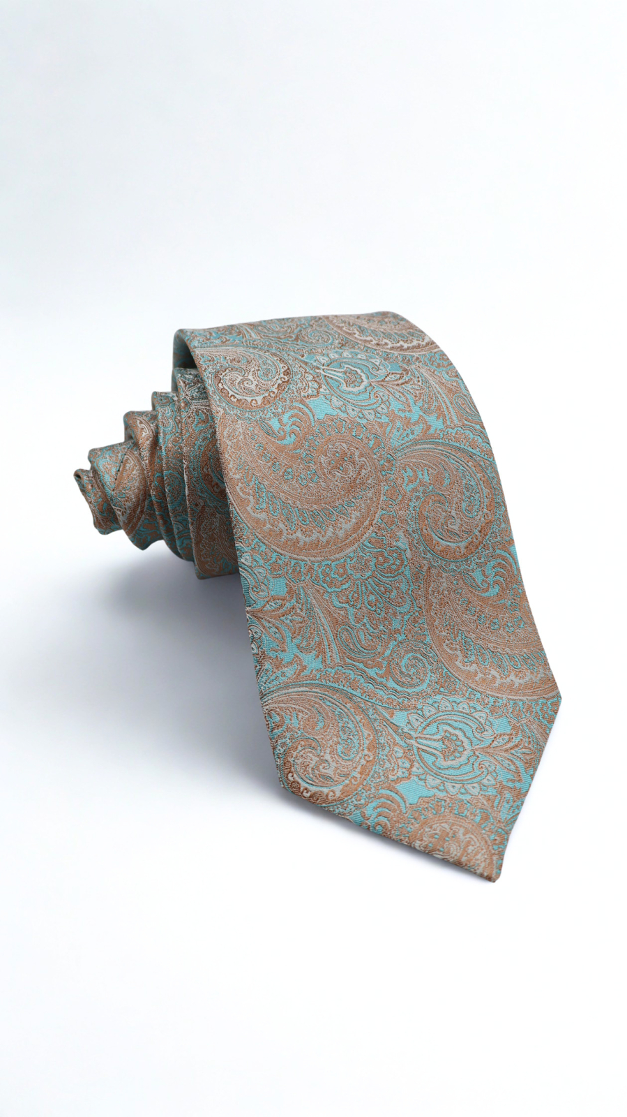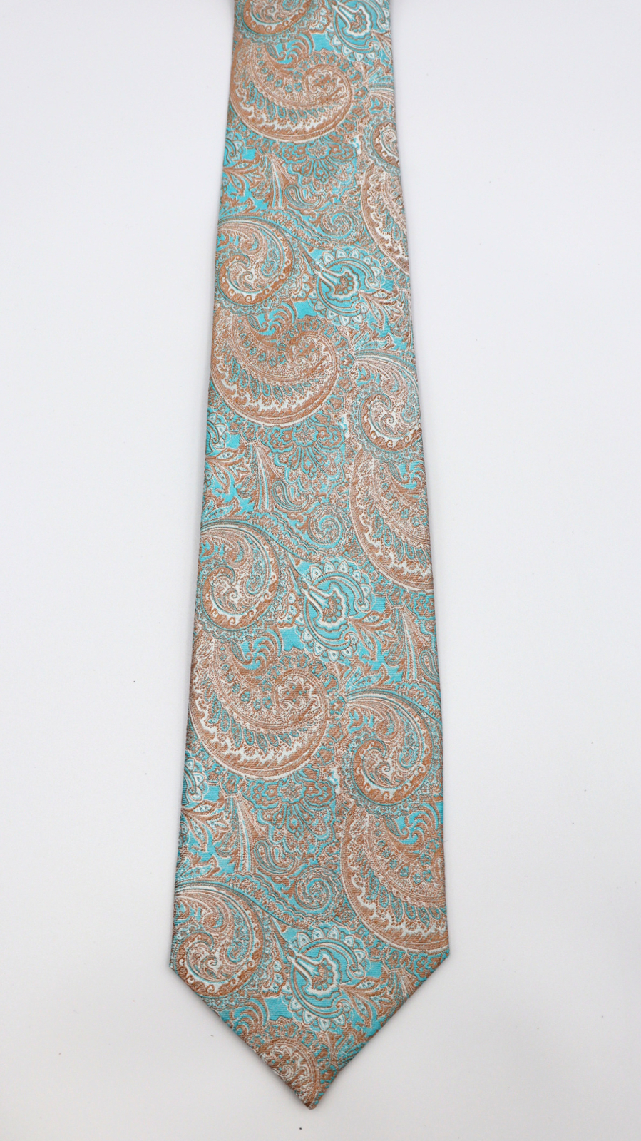 GAMA Cravată mătase naturală turcoaz cu model paisley bronz-auriu si alb