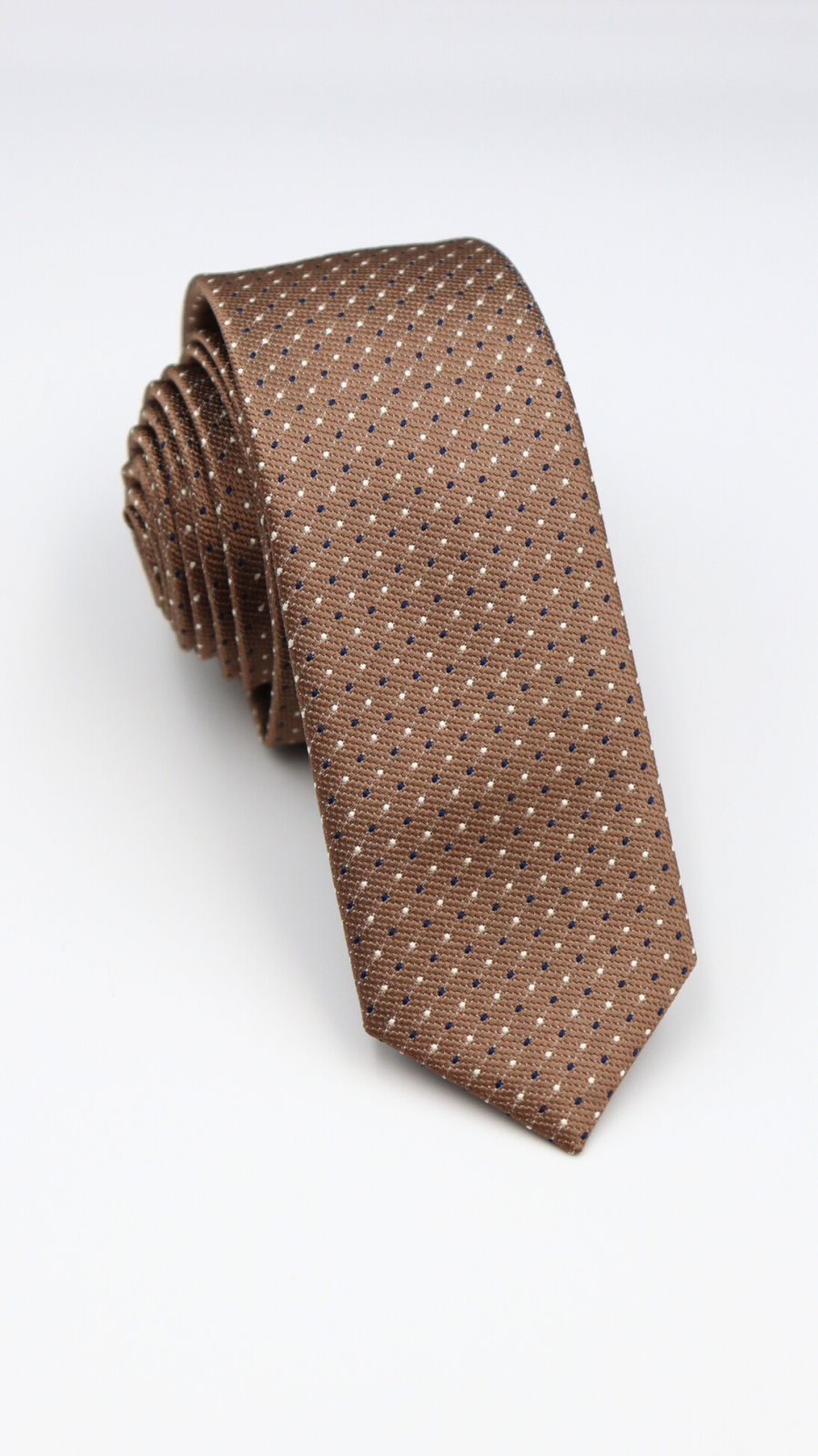 Cravata ingusta confectionata din material textil, de culoare maro cu picouri alb si bleumarin . Se poate combina cu o varietate de costume si camasi. Latimea varfului este de 5 cm.