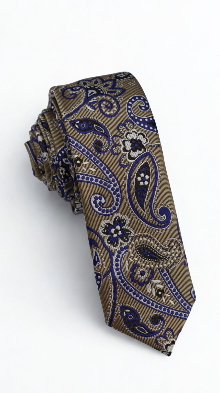 Cravata ingusta confectionata din material textil, de culoare maro deschis cu paisley albastru și alb . Se poate combina cu o varietate de costume si camasi. Latimea varfului este de 5 cm.