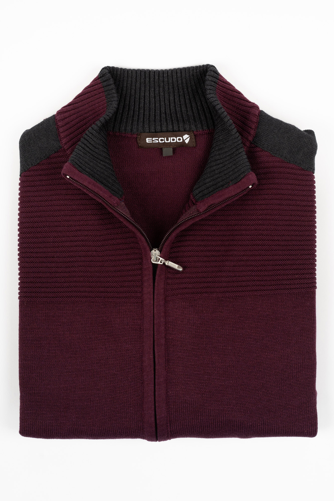 Această jachetă mov pruna, realizată din tricot de calitate superioară, îmbină stilul clasic cu un design modern. Textura ribbed adaugă un plus de rafinament.