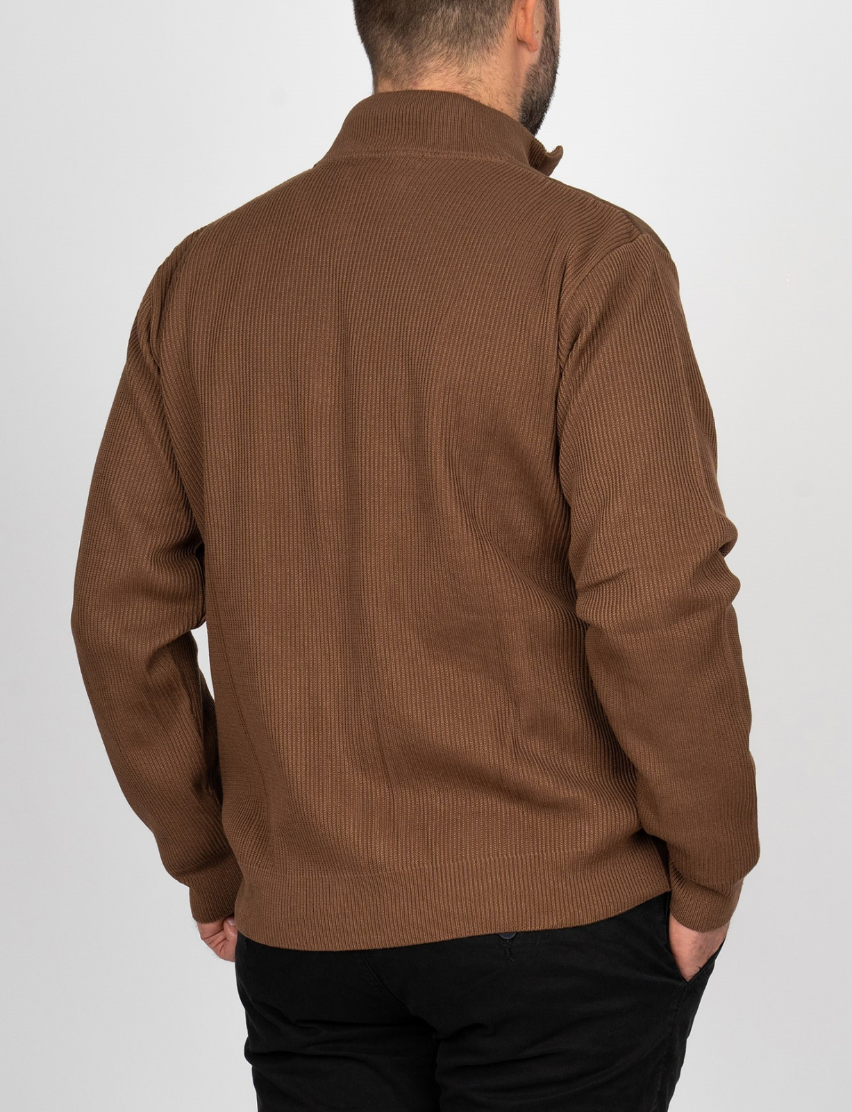 Jachetă maro cu fermoar și detalii din material fin – eleganță și confort într-o singură piesă